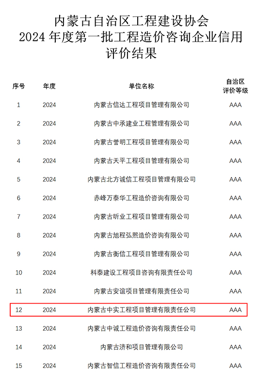2024-07-3015334 次近期,我公司参加内蒙古自治区工程建设协会组织的“2024年度第一批工程造价咨询企业信用”申报,获得“信用AAA级证书”。我公司成立多年以来,遵循中国工程造价管理协会对造价咨询企…
